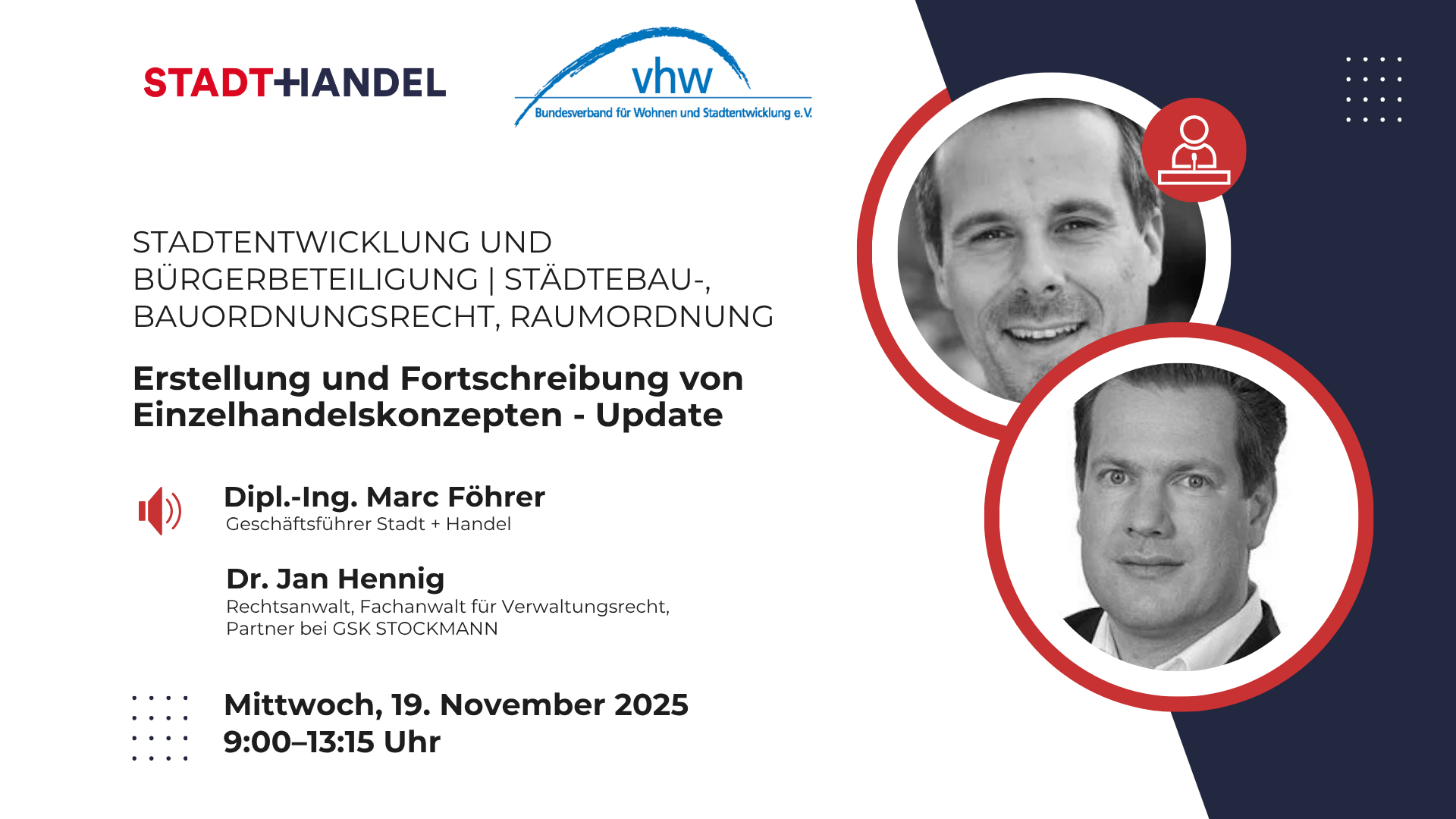 Im Webinar werden die Schwerpunkte, Anforderungen und Elemente von modernen Einzelhandels- Zentren- und Nahversorgungskonzepten ebenso wie ihre Rolle bei der planungsrechtlichen Steuerung des Einzelhandels und möglicherweise weiterer frequenzorientierter Nutzungen in ausführlicher Weise vorgestellt. Ihre praktische Bedeutung wird insbesondere bei dem Umgang mit aktuellen Entwicklungen im Zusammenhang mit den Auswirkungen der Corona-Pandemie, der Interpretation aktueller Urteile, der Post-Corona-Innenstadt-entwicklung und bei der Sicherung der wohnungsnahen Grundversorgung aufgezeigt.