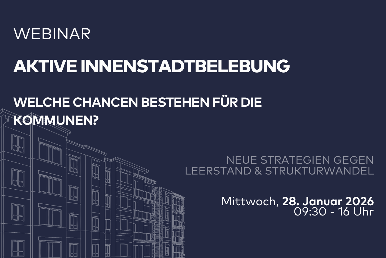 Im Webinar geht es darum, wie die Kommunen auf die Veränderungen im Einzelhandel reagieren können und welche Chancen sich hieraus ergeben. Es werden Ihnen konkrete Handlungsansätze aufgezeigt, um dem Zukunftsraum Innenstadt mehr Lebensqualität durch Kultur, Gastronomie, Dienstleistung, Handel und Freizeit zu geben.
